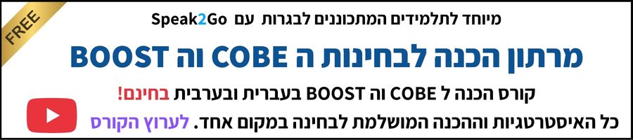 Speak2Go caters to various sectors and educational types in Israel, including ממלכתי (secular), ממלכתי דתי (religious), חרדי (ultra-Orthodox), חינוך מיוחד (special education), and מזרח ירושלים (East Jerusalem). It covers Elementary, Junior High, and High School levels, providing comprehensive preparation for COBE and BOOST for both Hebrew and Arabic-speaking students.